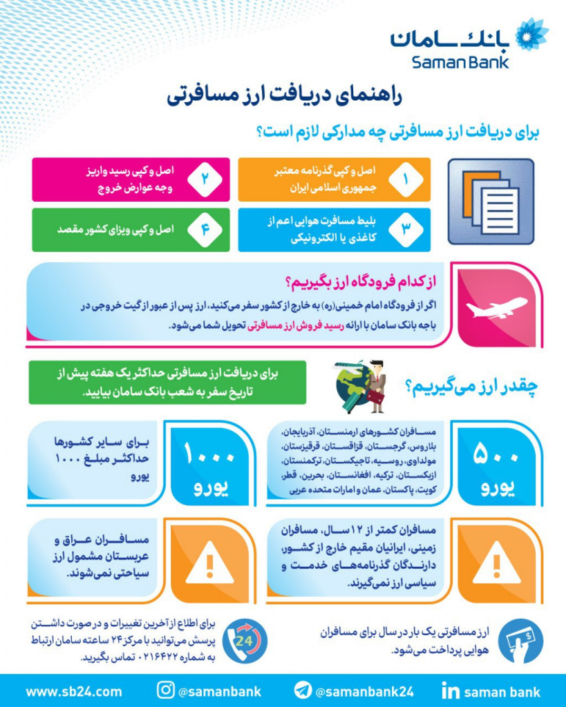 - ارز مسافرتی بانک سامان : تا حالا ازشون ارز نگرفتم ولی اینجوری بود که وارد بانک شدم اپراتور گفت وقت میدیم مثل بانک ملی برو بیا، ولی وقت ۲-۳ روز آینده میدن، باید ۲-۳ روز قبلش برید وقت بگیرید.